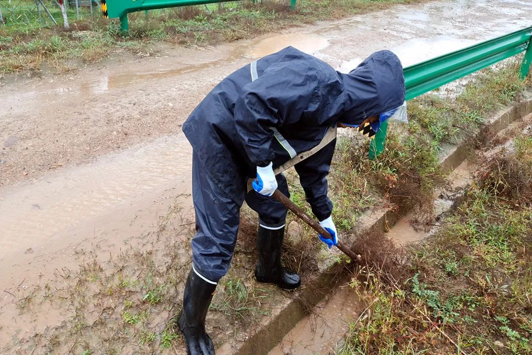 ▲10月5日,中廣核大寧縣三多鄉光伏電站人員及時進行排水渠清理,防止因雨水流通不暢而致使道路沖毀