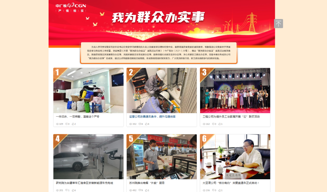 開設“我為群眾辦實事”專題網頁,曬辦實事成果。中廣核推出專題網頁,集中展示各單位“我為群眾辦實事”代表性成果,每月對成果進行滾動更新。通過各單位曬成果,接受群眾監督、開展群眾評價,形成各級黨組織聚焦聚力、廣大黨員積極行動、員工群眾踴躍參與的良好局面。