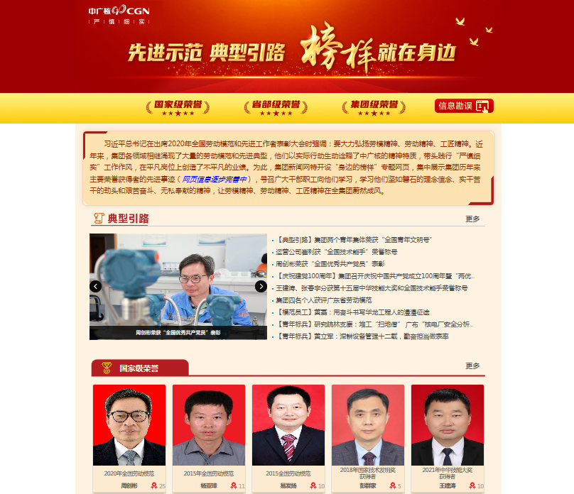 搭建“身邊的榜樣”專題網頁,傳播先進典型事跡。中廣核策劃推出“身邊的榜樣”專題網頁,按照國家級、省部級、集團級分類梳理建立個人榮譽檔案,集中展示先進典型的主要榮譽、工作經歷、歷年獲獎情況、先進事跡、主要貢獻及相關事跡報道,以身邊榜樣的優秀事跡,展現中廣核人的優良傳統,彰顯中廣核人的精神底色。