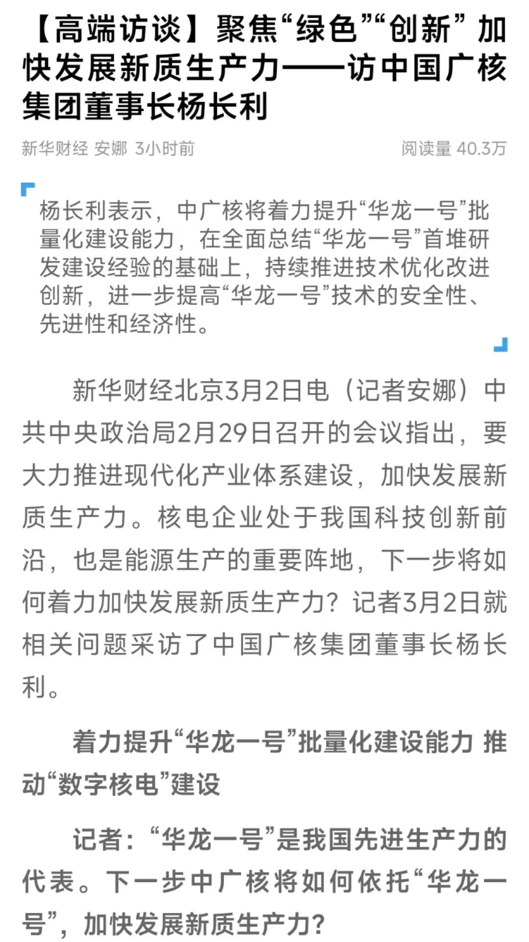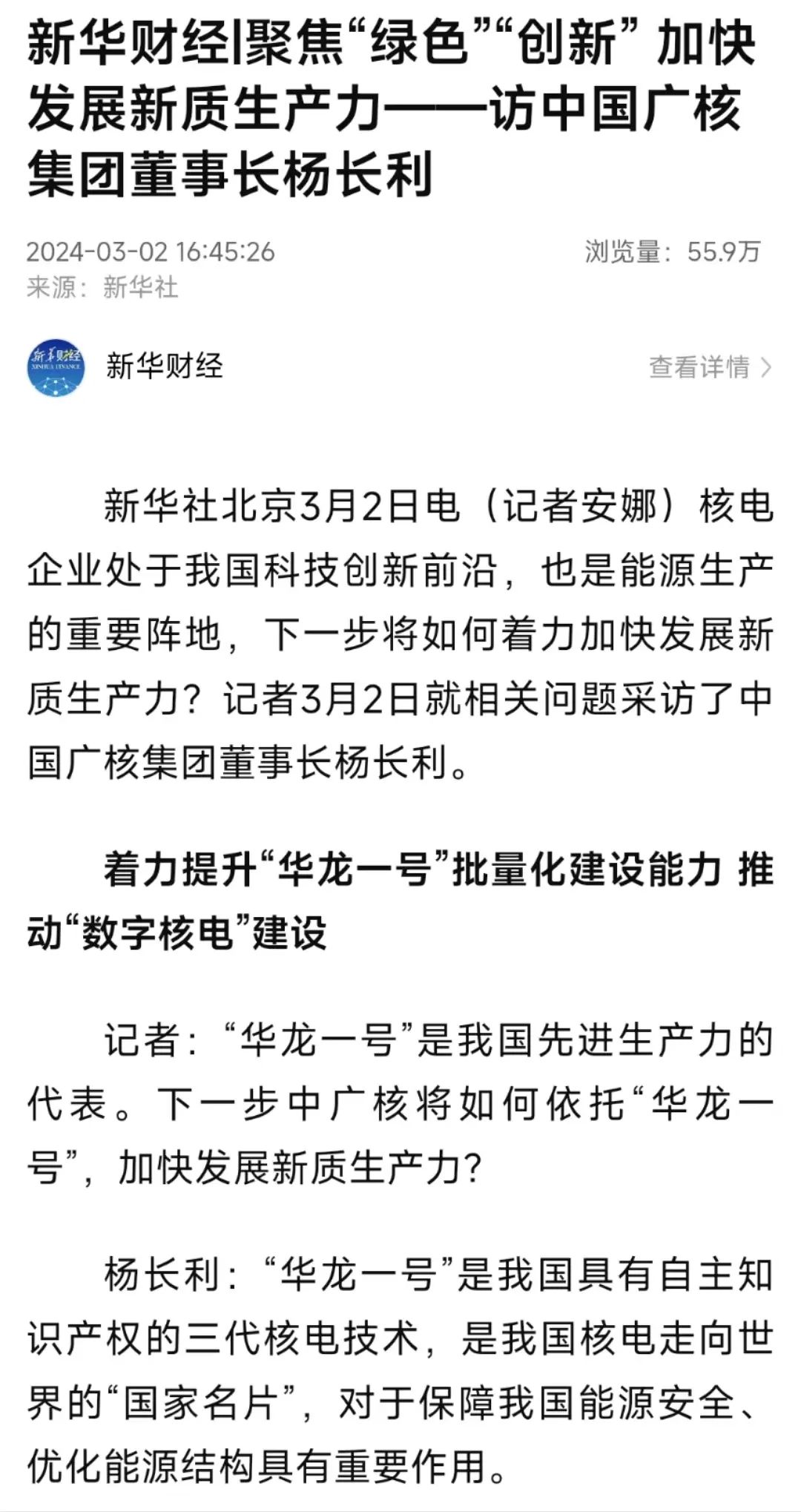 3月2日,新華社聚焦“綠色”“創新” 加快發展新質生產力,專訪第十四屆全國政協委員,中國廣核集團有限公司黨委書記、董事長楊長利。報道中提到中廣核將著力提升“華龍一號”批量化建設能力,推動“數字核電”建設以及新能源業務高質量發展,進一步優化科技創新布局在核醫學等領域開展科技攻堅。