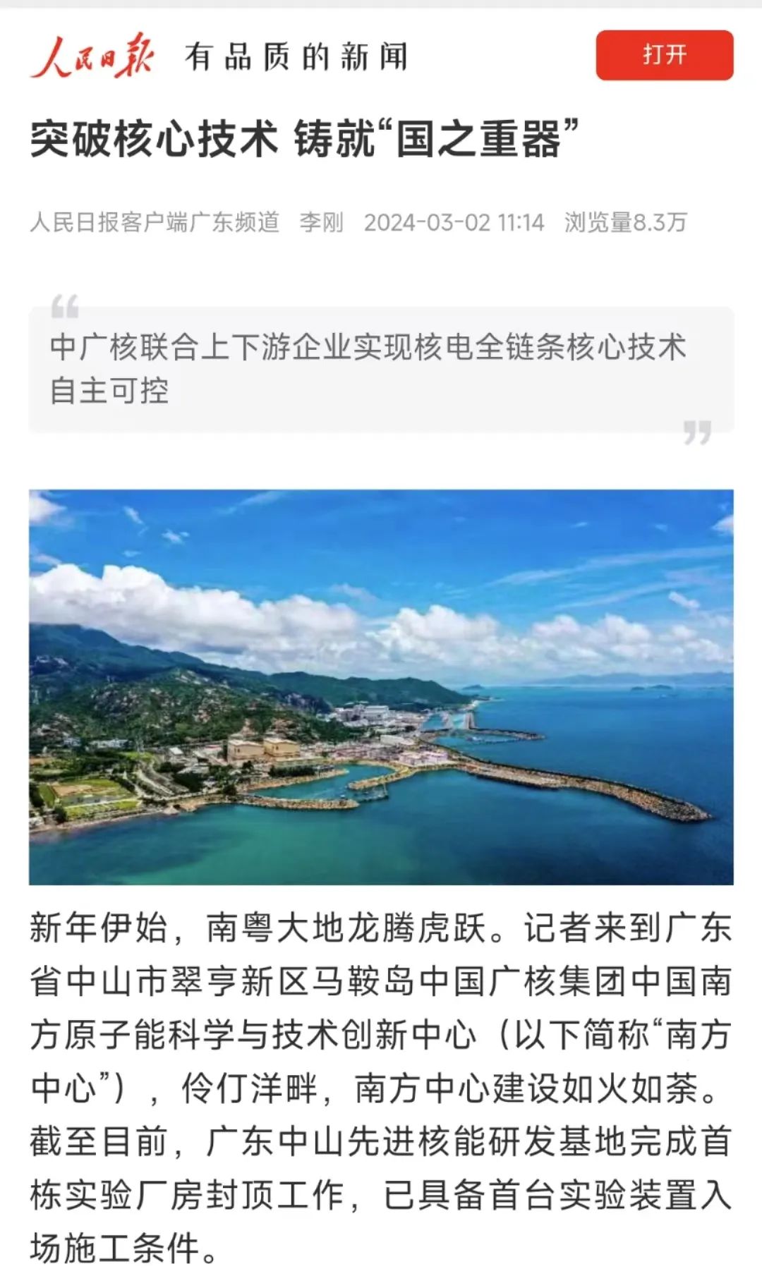 南方中心是中廣核深入實施創新驅動發展和“清潔能源+”戰略的積極實踐,聚焦先進核能原創技術策源地建設和戰略性新興產業布局,圍繞“華龍一號”、先進四代核能技術等新型核電堆型研發和原創技術攻關,以“一總部三基地”布局,在深圳、中山、陽江同步建設,立足灣區、支持全省、輻射全國,助力粵港澳大灣區科技創新、“一核一帶”區域產業發展,為打造新質生產力供給提供新引擎。
