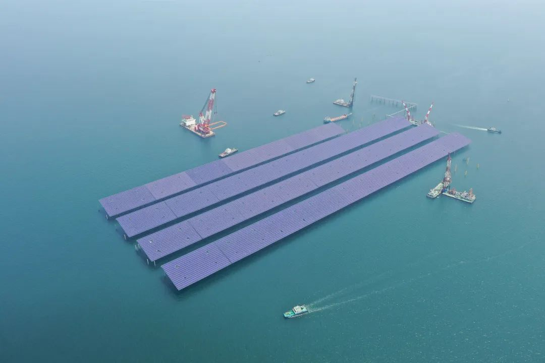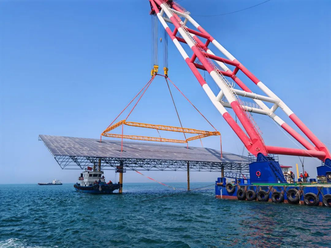 中廣核煙臺招遠400MW海上光伏項目于2023年12月26日正式開工,2024年4月6日首片上部結構順利完成吊裝,實現了全國范圍內規模化海上光伏“零的突破”。2024年7月2日升壓站一次帶電成功,標志著我國首個大規模樁基固定式深水海上光伏項目具備投運條件。截至目前,該項目陸上升壓站、送出線路、海纜敷設已完成,光伏區鋼管樁沉樁和海上光伏網架吊裝正在有條不紊進行。