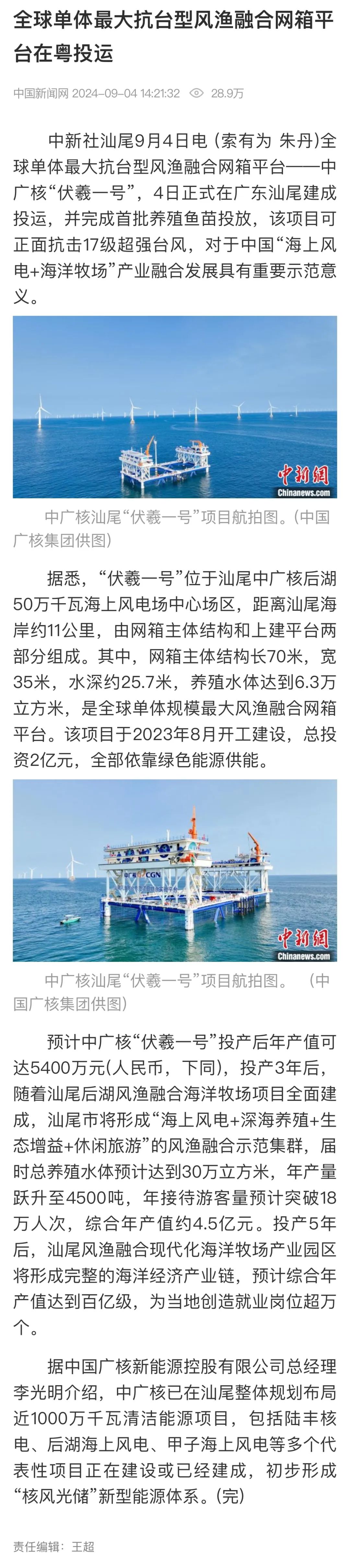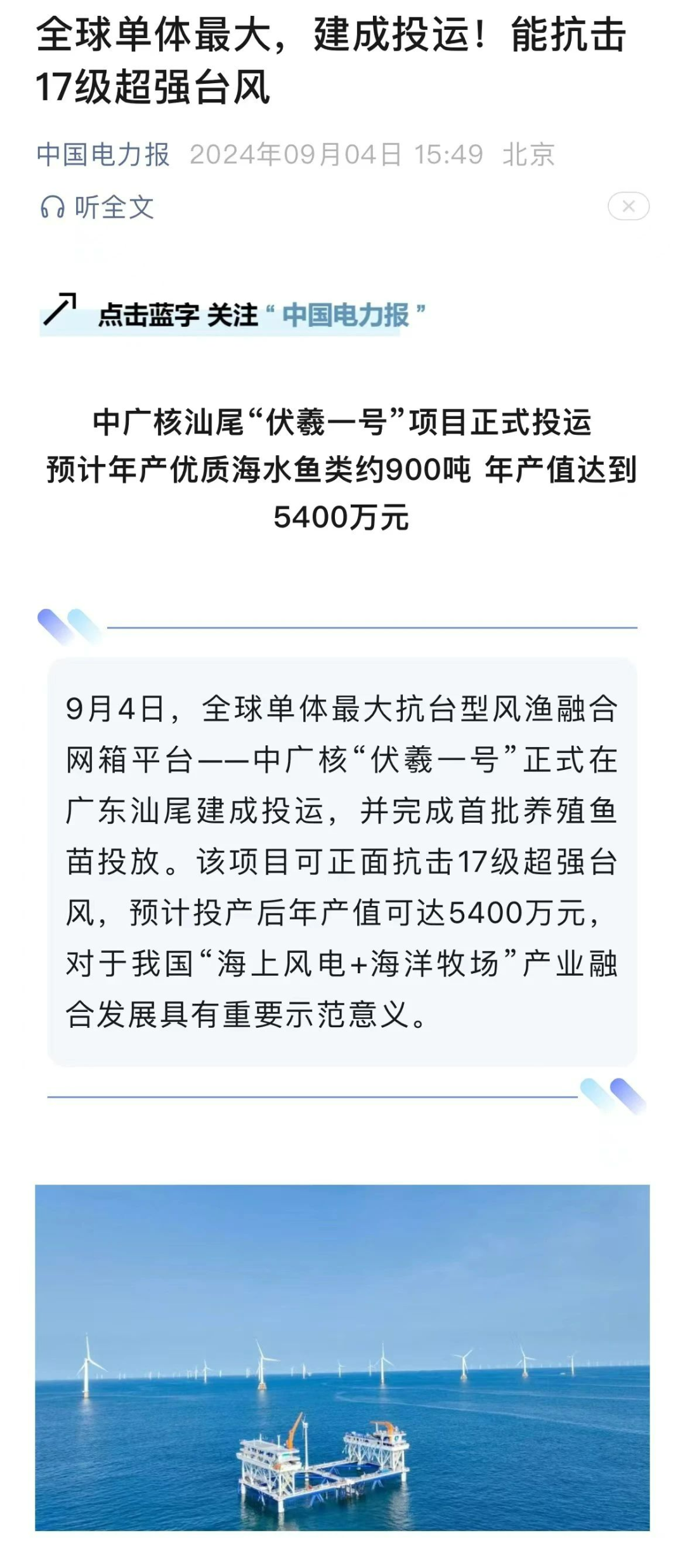9月4日,中廣核汕尾“伏羲一號”風漁融合項目正式投運,并完成首批養(yǎng)殖魚苗投放,該項目可正面抗擊17級超強臺風,預(yù)計投產(chǎn)后年產(chǎn)值可達5400萬元,對于我國“海上風電+海洋牧場”產(chǎn)業(yè)融合發(fā)展具有重要示范意義。人民日報、新華社、央視等數(shù)十家主流媒體對此進行聚焦報道。
