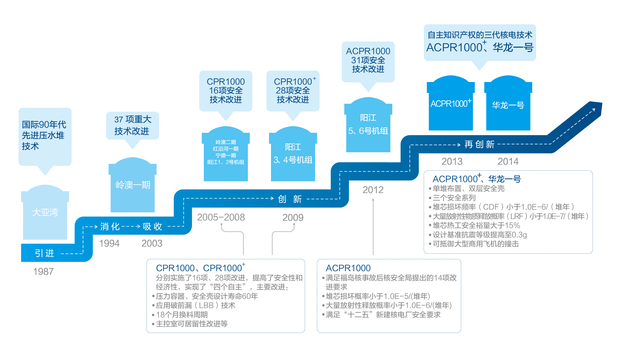 (1)中國自上世紀八十年代引進國外技術,通過消化、吸收和再創(chuàng)新,全面實現了自主設計、自主制造、自主建設和自主運營,并跨入了"自主 創(chuàng)造 "的新階段,具備了形成自主知識產權三代核電技術的條件。